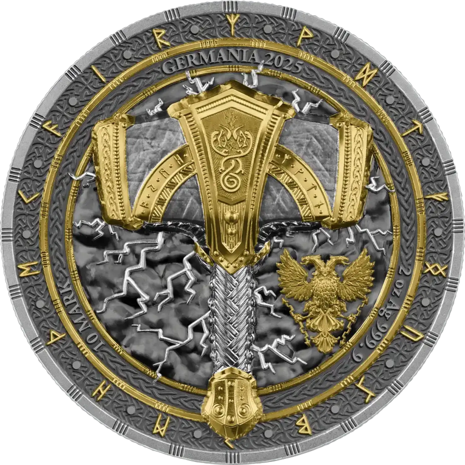 Here are the key specifications for the 2025 2 oz Artefacts: Mjölnir Silver Coin: