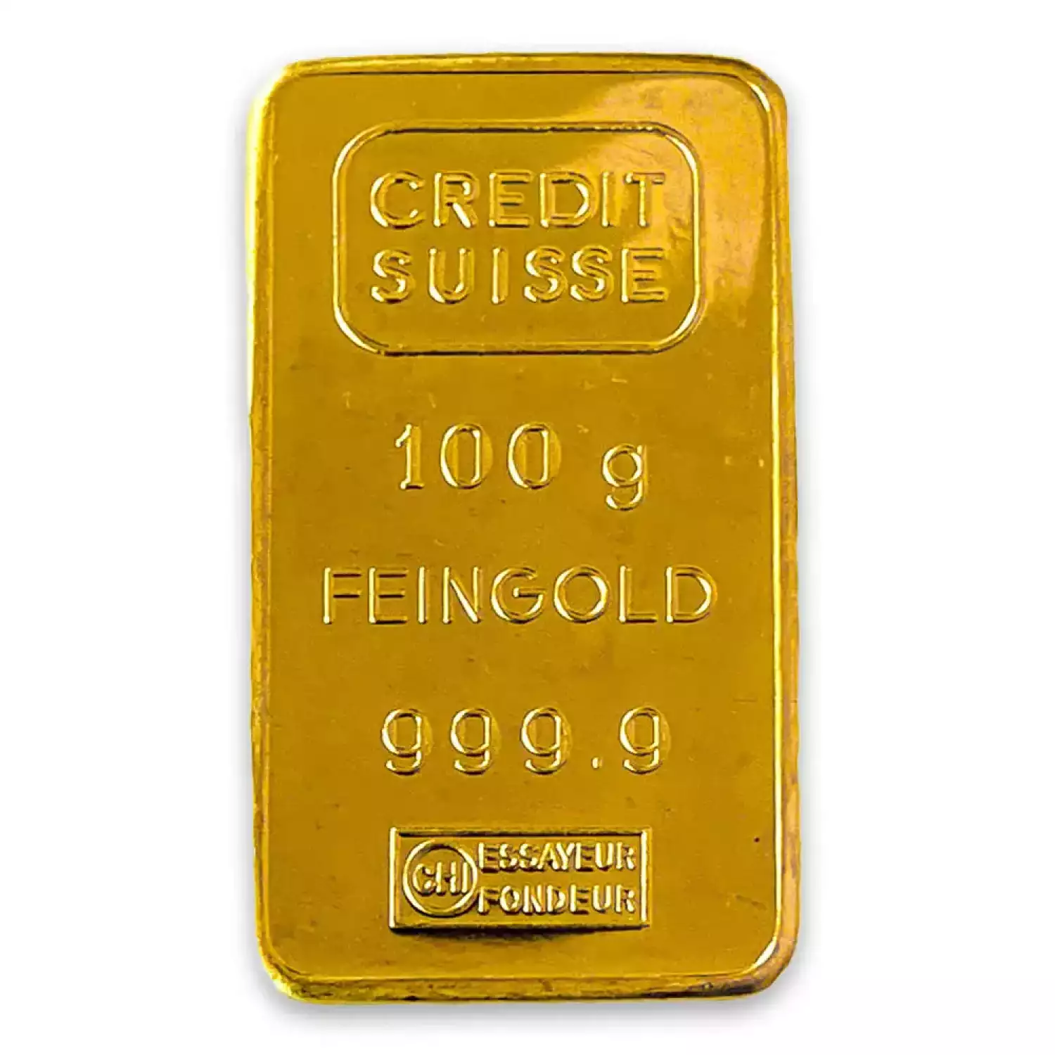 Credit Suisse is one of the leading precious metal brands in the world although they no longer own the refinery/mint that produces the gold bars for them. Each 100g Credit Suisse Gold Bullion Bar contains 100 grams of .9999 fine gold. The Reverse of the gold bar depicts the Credit Suisse logo along with the purity and weight. Most Credit Suisse 100g gold bars in the United States were purchased in Europe and brought by their owners to the U.S..
